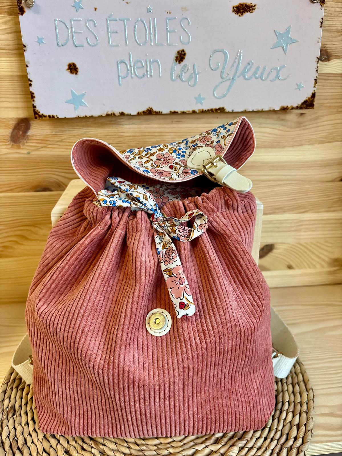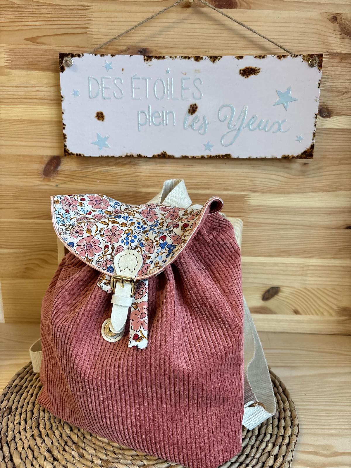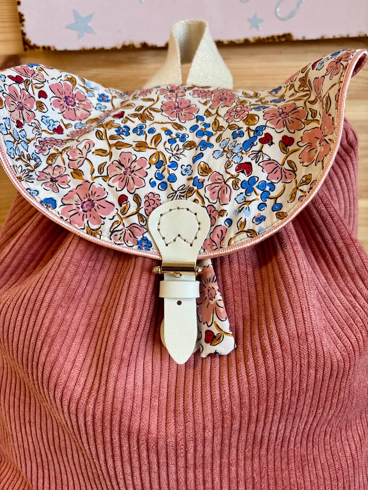 Sac à dos enfant velours côtelé Vieux Rose – Motif Fleuri Liberty – Fait main en France